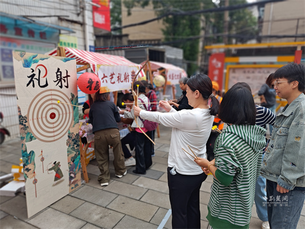 游戲互動區(qū)氛圍熱烈?!吧涓膊轮i”攤位前,居民踴躍參與,猜中謎底者可獲贈汪玉霞蘇月餅;“投壺納?!蔽娙艘辉嚿硎郑谌の吨懈惺芄哦Y韻味;“福來套圈”則準備了洗衣液、透明皂等實用獎品,深受居民喜愛。此外,“六藝禮射”項目讓居民親身體驗傳統(tǒng)射藝,在拉弓搭箭間感受古人的尚武精神與禮儀風范。