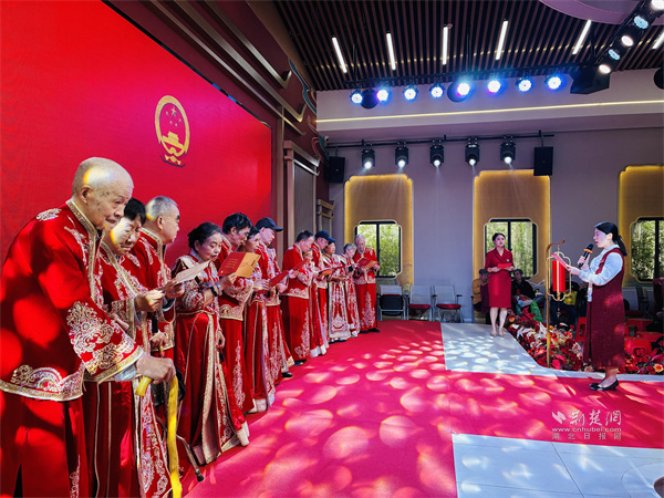 隨著輕柔音樂響起,身著中式禮服的夫婦們手挽手踏上紅毯。歲月雖在臉龐刻下痕跡,卻擋不住眼中對(duì)彼此的溫柔。他們共同執(zhí)筆書寫婚書,一撇一捺間重溫“執(zhí)子之手”的初心;交杯共飲合巹酒,延續(xù)“同甘共苦”的承諾;交換黑檀朱砂掛件,“你一半我一半”的信物成了彼此最深的牽絆。在婚姻登記處頒證員的見證下,夫婦們接過“結(jié)婚紀(jì)念證書”與鮮花,現(xiàn)場(chǎng)掌聲、祝福聲此起彼伏。