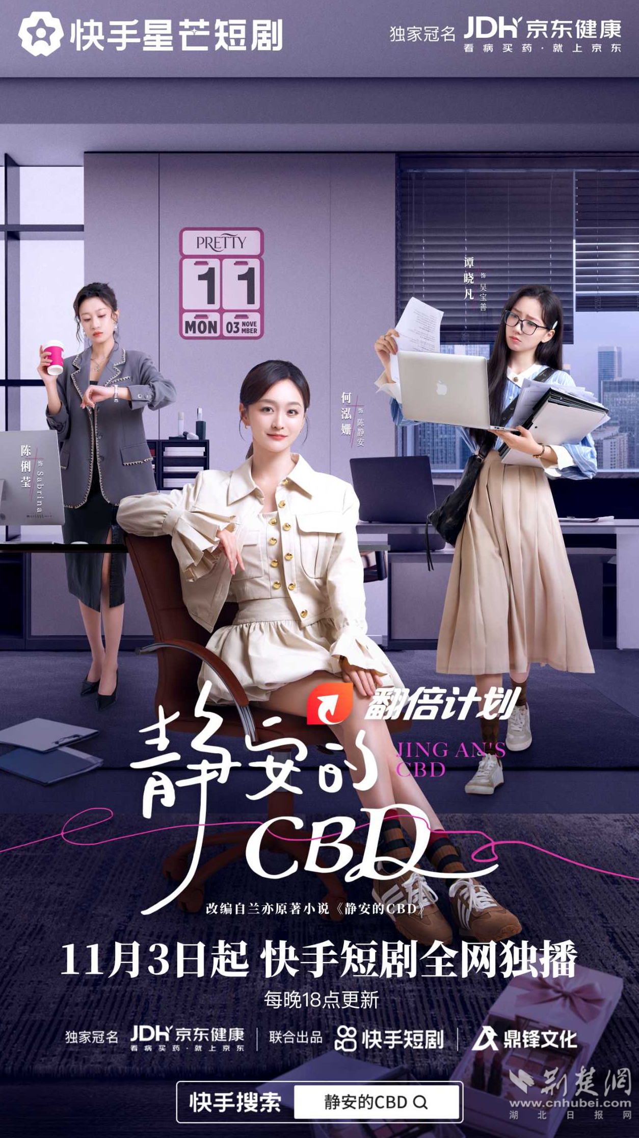 荊楚網(wǎng)(湖北日?qǐng)?bào)網(wǎng))訊(通訊員 恩正)畫(huà)最愛(ài)的女神妝,走最颯的職場(chǎng)路。近日,都市職場(chǎng)題材短劇《靜安的CBD》宣布定檔,將于11月3日在快手短劇進(jìn)行全網(wǎng)獨(dú)播。據(jù)悉,該劇由京東健康獨(dú)家冠名,快手與鼎鋒文化共同出品,孔令飛傾情執(zhí)導(dǎo),何泓姍領(lǐng)銜主演,將用22集篇幅描繪跨越代際的女性職場(chǎng)群像,呈現(xiàn)Z世代女孩的青春奮斗故事。