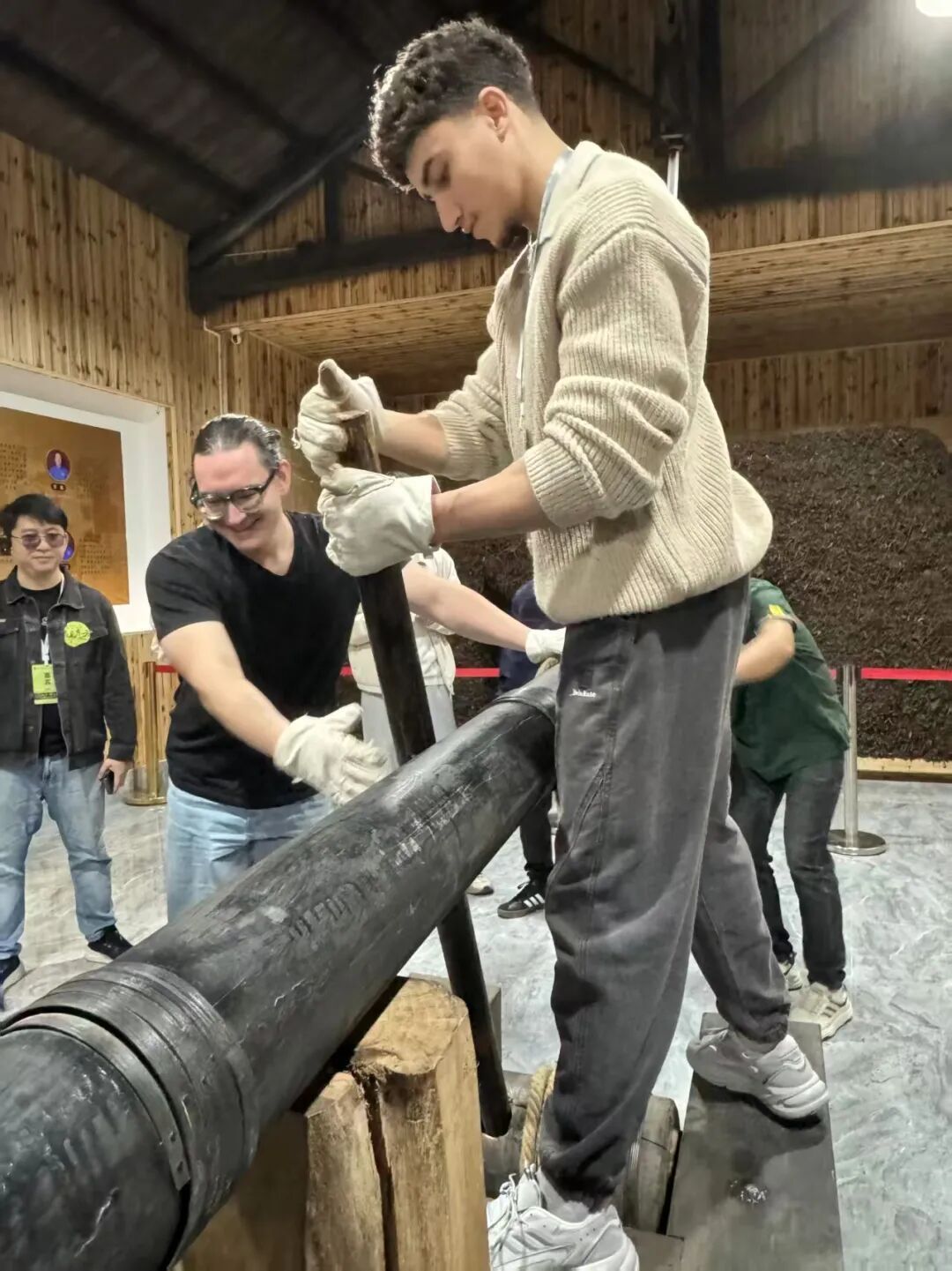 留學生在中國青磚茶非遺技藝傳承館體驗壓制青磚茶。