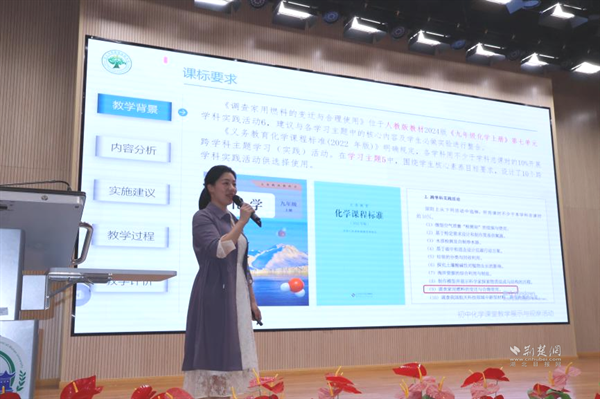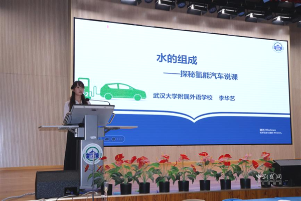 武漢大學附屬外語學校李華藝老師執(zhí)教《水的組成——探秘氫能汽車》展示課。課程以新能源汽車為線索,設(shè)計四大項目,學生通過海報、角色扮演等形式展示探究成果。李老師引導學生從宏觀、微觀、符號三重視角認識水的組成,最終用電解產(chǎn)生的氫能讓小車現(xiàn)場行駛,實現(xiàn)化學與科技的有機融合。說課環(huán)節(jié)中,她介紹項目圍繞“氫能汽車如何工作”展開,借助AI模擬生產(chǎn)過程,讓學生感受化學的實踐價值。