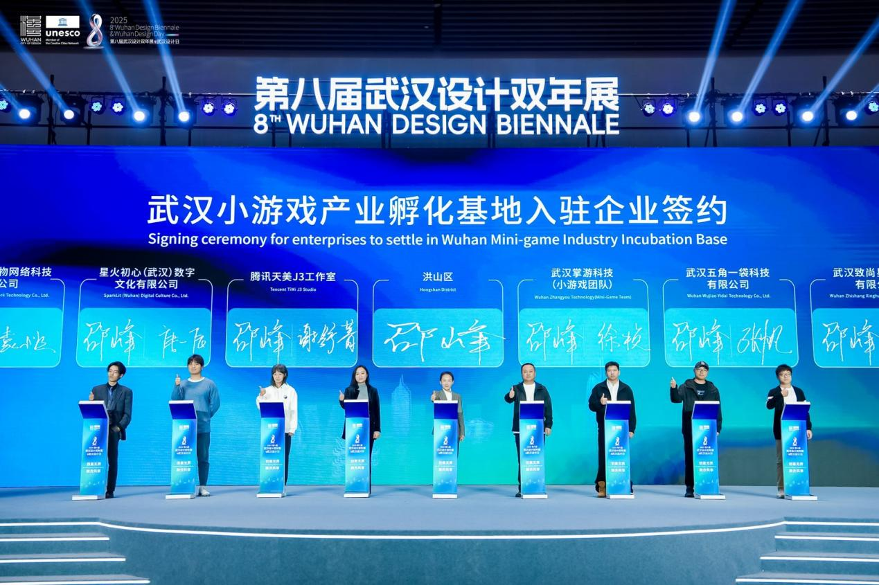 榮譽之外,產(chǎn)業(yè)合作是設(shè)計價值轉(zhuǎn)化的關(guān)鍵。開幕式現(xiàn)場,8家企業(yè)簽約入駐全國首家小游戲產(chǎn)業(yè)孵化基地——“武漢市小游戲產(chǎn)業(yè)孵化基地”,他們中既有充滿朝氣的新生代小游戲團隊,也有掌游科技這樣的行業(yè)領(lǐng)軍者,更有騰訊天美J3工作室等頂尖力量,他們將攜手打破行業(yè)邊界、共享資源平臺,共同推動數(shù)字創(chuàng)意產(chǎn)業(yè)與設(shè)計融合發(fā)展。