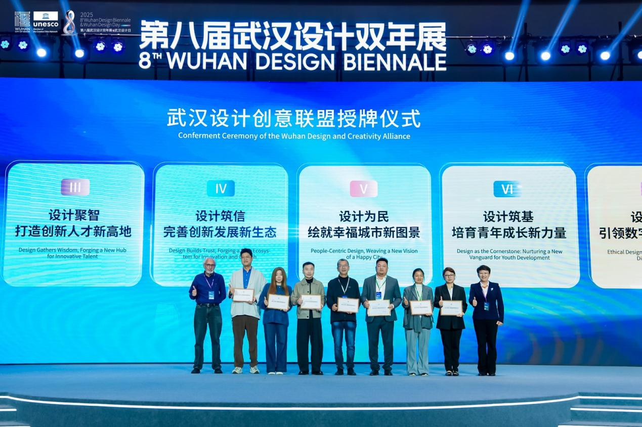 武漢有設(shè)計相關(guān)專業(yè)高校50余所,設(shè)計專業(yè)在校學(xué)生近10萬人,設(shè)計相關(guān)企業(yè)突破1萬家,10余個設(shè)計行業(yè)協(xié)會,從業(yè)人員超50萬,形成了強大的“設(shè)計創(chuàng)意聯(lián)盟”,催生出了集產(chǎn)業(yè)鏈、創(chuàng)新鏈、人才鏈、價值鏈于一體的融合創(chuàng)新發(fā)展生態(tài)體系。在開幕式的最后,“武漢設(shè)計創(chuàng)意聯(lián)盟”正式授牌,來自設(shè)計企業(yè)、行業(yè)協(xié)會、高校院所和獨立設(shè)計師等領(lǐng)域多元設(shè)計力量代表共同見證。未來,“武漢設(shè)計創(chuàng)意聯(lián)盟”將奮力實現(xiàn)設(shè)計融城,構(gòu)筑協(xié)同發(fā)展新范式;設(shè)計賦能,激活產(chǎn)業(yè)升級新動能;設(shè)計聚智,打造創(chuàng)新人才新高地;設(shè)計筑信,完善創(chuàng)新發(fā)展新生態(tài);設(shè)計為民,繪就幸福城市新圖景;設(shè)計筑基,培育青年成長新力量;設(shè)計向善,引領(lǐng)數(shù)字文明新航向;設(shè)計聯(lián)通,拓展國際交往新空間八大目標(biāo)。