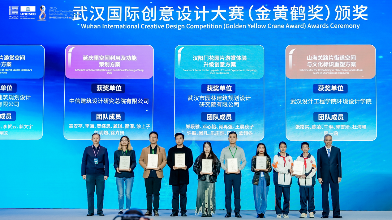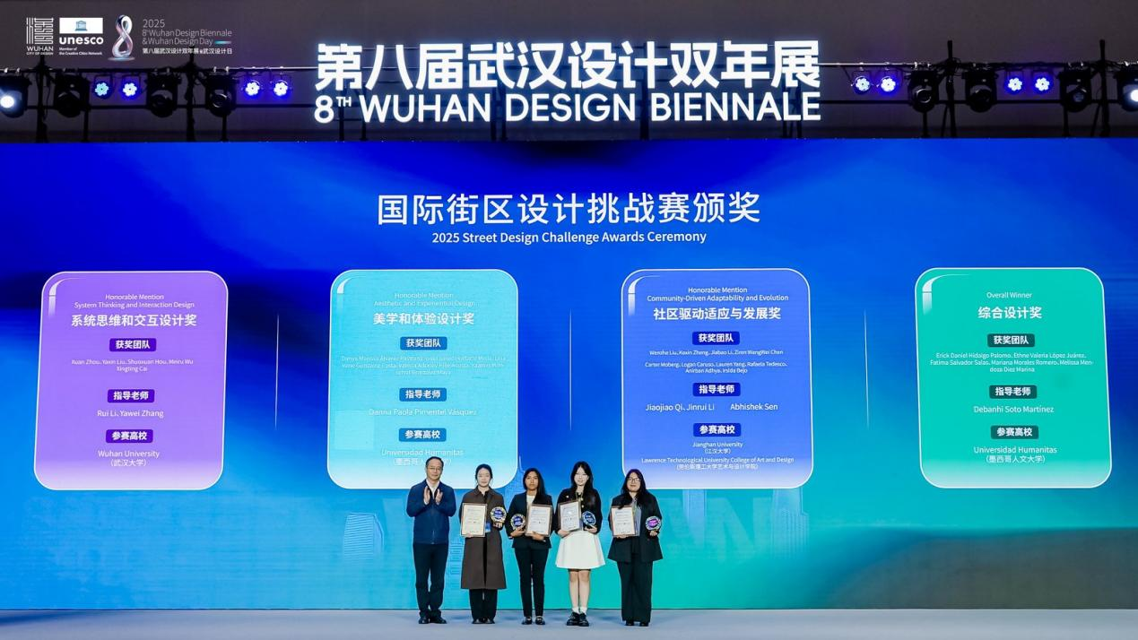 開幕式上,2025年武漢國際創(chuàng)意設(shè)計大賽(金黃鶴獎)與 2025年國際街區(qū)挑戰(zhàn)賽頒獎儀式同步舉行。其中,象征武漢設(shè)計創(chuàng)新探索的“金黃鶴獎”,今年特意選取黃鶴樓、山海關(guān)路、漢陽門等市民常去、關(guān)注度高、滿滿煙火氣的城市地標(biāo)作為設(shè)計對象,不限專業(yè)和地域,征集更宜人的更新提升方案。現(xiàn)場,武漢瑞拓建筑設(shè)計咨詢有限公司等6個專業(yè)組一等獎和最佳組織獎武漢市七一華源中學(xué)等獲獎代表接受頒獎。國際街區(qū)挑戰(zhàn)賽,則是由聯(lián)合國教科文組織設(shè)計之都城市聯(lián)合舉辦,全球高校團隊共同參與的國際設(shè)計賽事。經(jīng)過全球30位權(quán)威專家1個月的精心細(xì)致評審,選出了四個優(yōu)勝方案?,F(xiàn)場,為交互設(shè)計獎獲獎團隊武漢大學(xué)、美學(xué)設(shè)計獎獲獎團隊墨西哥人文大學(xué)、社區(qū)發(fā)展獎獲獎團隊江漢大學(xué)團隊和美國勞倫斯理工大學(xué)團隊,以及綜合設(shè)計獎獲獎團隊墨西哥人文大學(xué)頒獎。