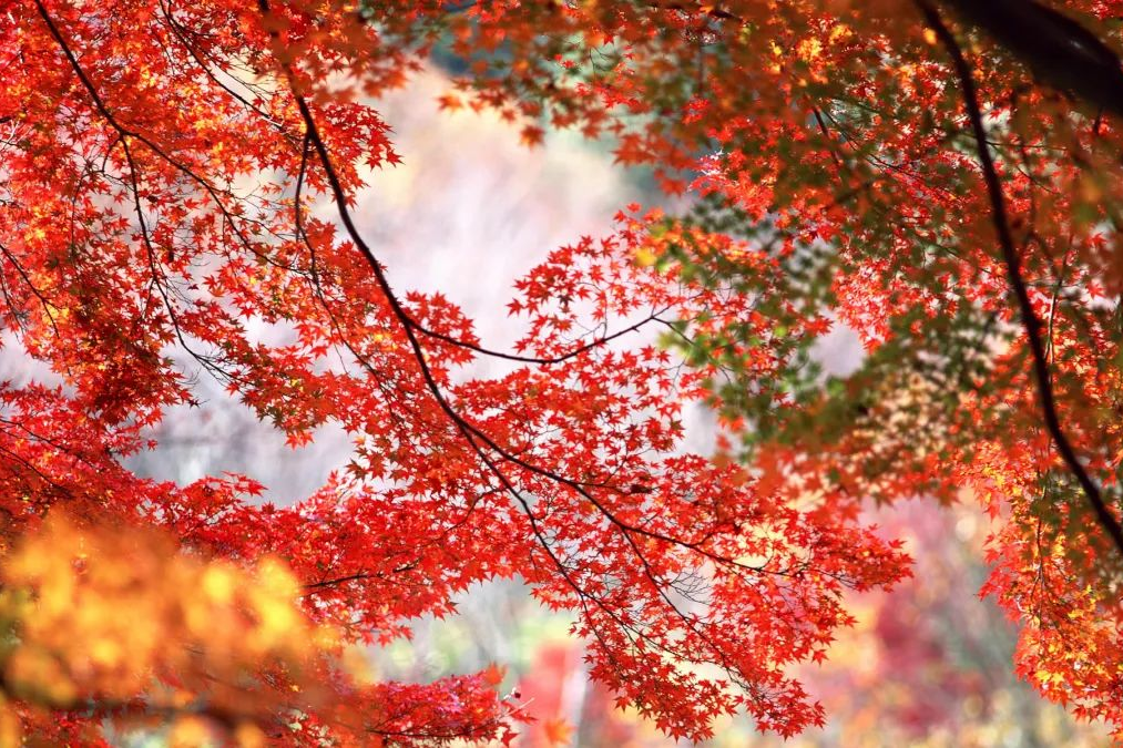 綿延的山谷像打翻的調(diào)色盤,紅色是主調(diào),其間點綴著金、橙和綠色,錯落有致,構(gòu)成一幅溫暖的秋景長卷。