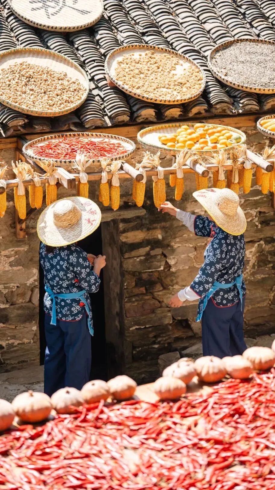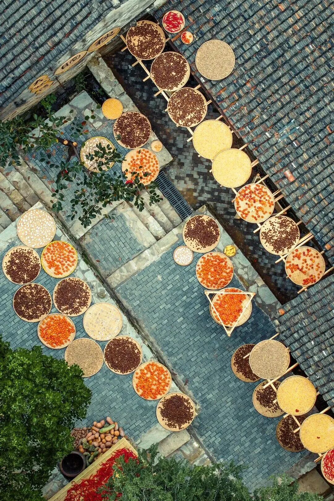 這不是擺設(shè)或表演,是真實的生活場景。家家戶戶門口擺放的竹匾里,晾曬的是他們一年勞作的收獲。