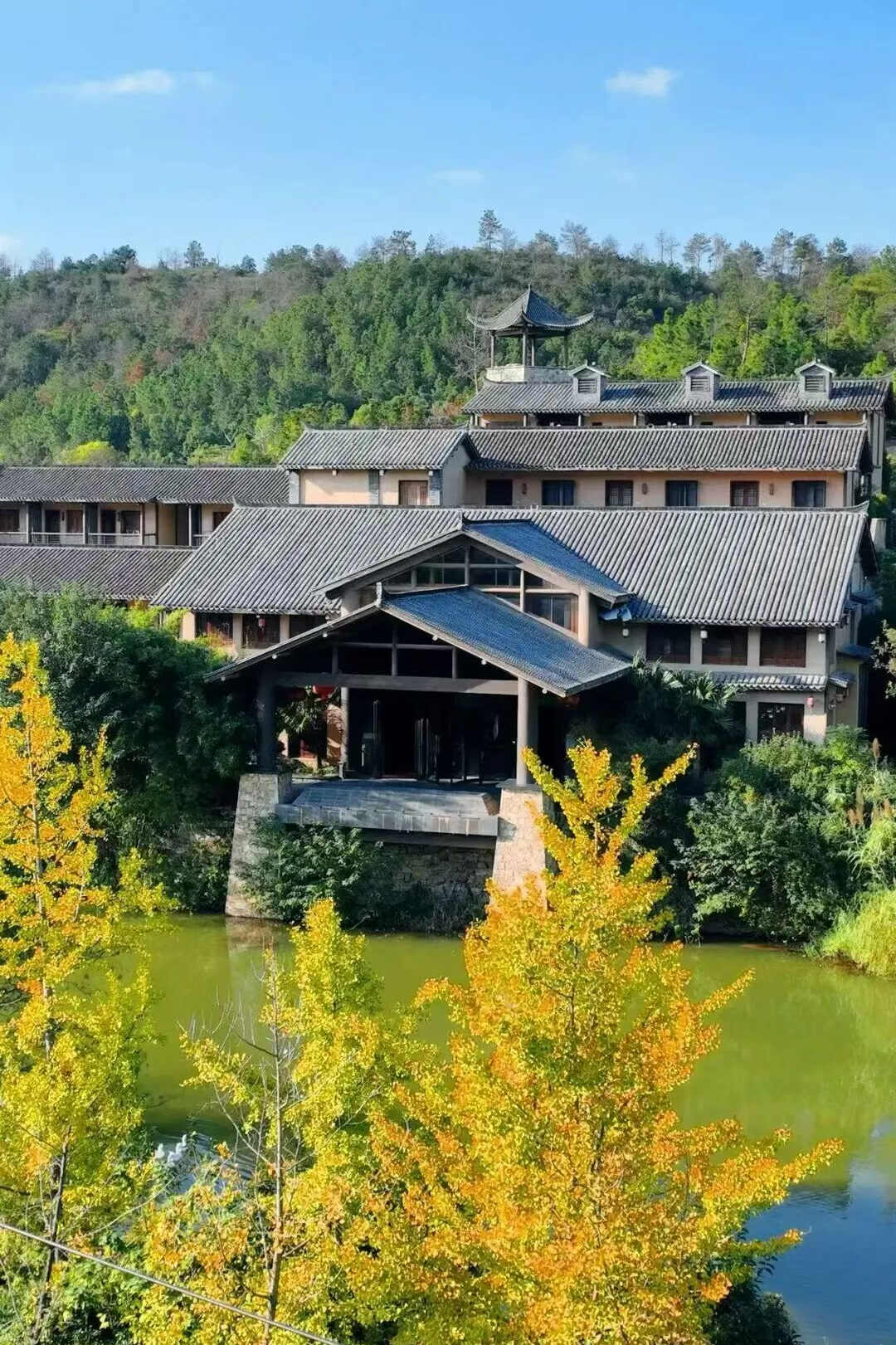 3. 梯田觀景處以銀杏與烏桕色彩為前景,遠(yuǎn)山為背景,呈現(xiàn)層次豐富的秋色。