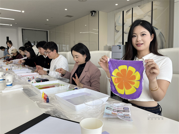 非遺手工絲巾水拓畫制作環(huán)節(jié),專業(yè)老師首先向黨員們介紹了絲巾水拓畫的歷史和制作技巧。在老師的指導(dǎo)下,黨員們紛紛拿起工具,發(fā)揮創(chuàng)意,將顏料滴入水中,通過輕輕攪拌和吹拂,讓顏料在水中自然暈染形成紋理后,將絲巾輕鋪在水面,色彩瞬間滲透,一幅幅絢麗的圖案便印染在了絲巾上。大家還邊制作邊交流討論,互相展示染好的作品,歡聲笑語不斷。