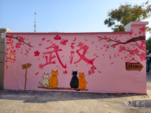 次日,創(chuàng)作進入精修階段。志愿者們細致調(diào)整“武漢”字樣的色彩飽和度,用粉白顏料層層暈染出飛揚的櫻花花瓣。四只形態(tài)各異的貓咪相依蹲坐,靈動可愛;特意添加的“5號地鐵口”指引牌等實用元素,更讓作品兼具藝術(shù)性與功能性。創(chuàng)作過程中,不斷有居民和游客駐足觀賞,主動詢問設(shè)計理念?!拔覀兿胪ㄟ^櫻花、貓咪等元素,展現(xiàn)武漢的浪漫與煙火氣?!敝驹刚咭贿呎{(diào)色一邊向圍觀群眾講解。