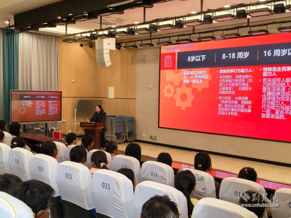 活動(dòng)中,武昌區(qū)人民法院白沙洲法庭余意法官以《未成年人民事法律行為效力》為題,用“未成年人網(wǎng)購(gòu)貴重物品是否有效”等案例,按年齡分層解析法律責(zé)任邊界,讓學(xué)生快速厘清不同階段的民事行為效力,直觀感受憲法及民事法律對(duì)青少年權(quán)益的保護(hù)。