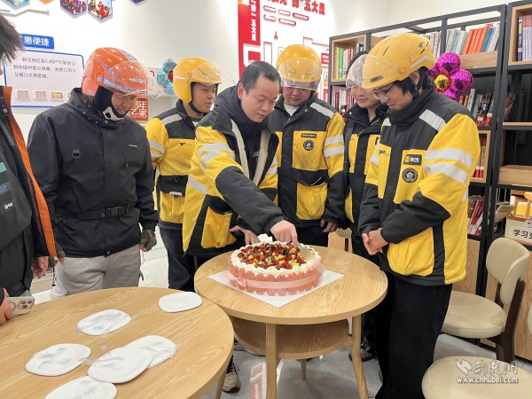 活動現(xiàn)場洋溢著濃濃的溫情。驛站內(nèi),“生日快樂”的主題裝飾錯落擺放,工作人員還精心準(zhǔn)備了定制生日蛋糕、可愛的生日帽,將小小的驛站裝點成充滿歡笑的“生日之家”。伴隨著熟悉的《生日快樂》旋律響起,外賣騎手、環(huán)衛(wèi)師傅們圍在一起,共同吹滅蠟燭、許下心愿,分享這份屬于他們的甜蜜與喜悅。
