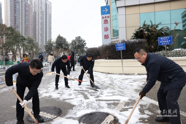 武漢大學(xué)人民醫(yī)院黨委書記、院長(zhǎng)與干部職工一同清掃院區(qū)積雪。 通訊員供圖