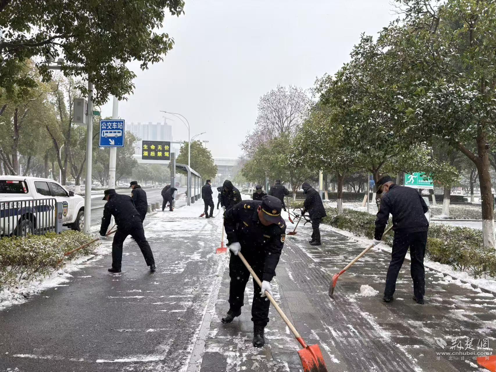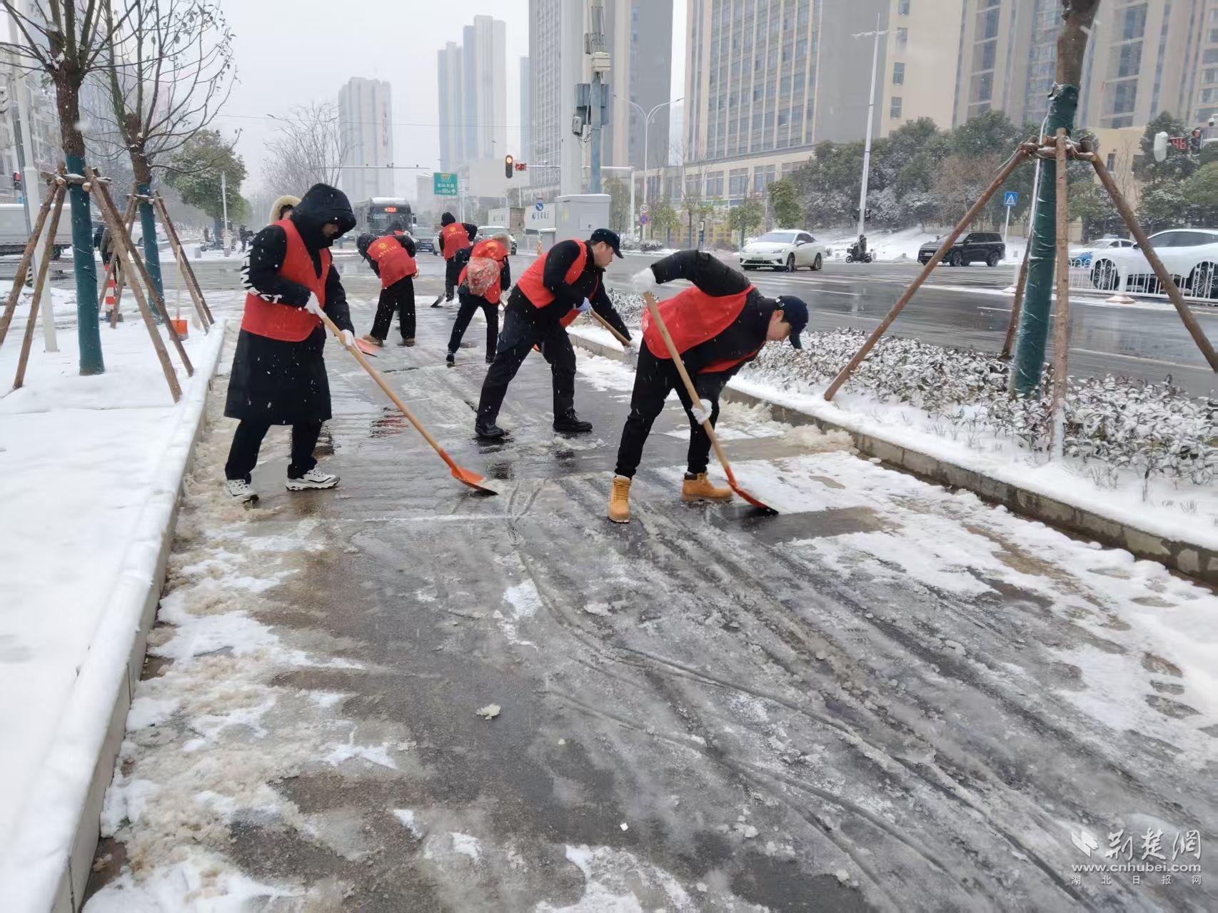寒風(fēng)雖冷,熱情不減。鐵鍬鏟冰聲、掃帚掃地聲格外清晰。湖北廣電的老黨員張??钙痂F鍬,帶頭干起來。“我們抓緊鏟!路通了,大家上班、上學(xué)、買菜才安心?!彼吀蛇呎f。家住二十四城的居民尹作意也不甘示弱,三葉士林的青年職工劉貝表示:“能為大家出把力,心里暖和?!痹谏鐓^(qū)書記潘飛飛的帶領(lǐng)下,大家3個小時連續(xù)作戰(zhàn),成功清除了沿線3公里人行道的積雪。