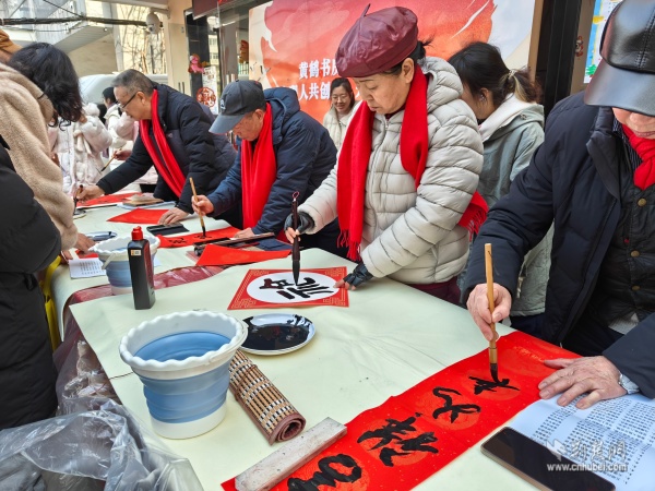 外場體驗(yàn)區(qū)更是精彩紛呈。在定制春聯(lián)區(qū),95歲高齡的社區(qū)居民黃勁勇老先生帶領(lǐng)首義書畫協(xié)會的老師們現(xiàn)場揮毫,筆走龍蛇。一副副對聯(lián)、一張張福字,承載著真摯祝福與新年期盼,吸引居民有序排隊(duì)領(lǐng)取。親子手工區(qū)、便民服務(wù)角與特色年貨市集同樣人氣高漲,居民在參與中感受文化、享受服務(wù)、樂購年貨。