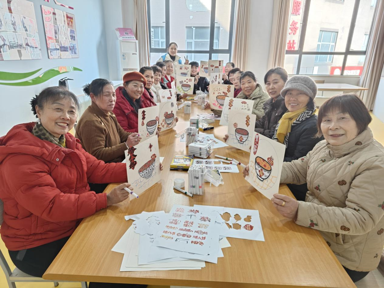 社區(qū)老年人活動中心內(nèi),老人們圍坐在一起體驗(yàn)“溫情臘八”手工繪畫,在創(chuàng)作中增進(jìn)鄰里情誼?!昂枚嗄隂]畫過畫了,今天好像回到了年輕時候!”74歲的李庭香老人舉著自己剛完成的《臘八團(tuán)圓圖》笑著說道。