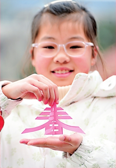 免費(fèi)領(lǐng)取新春剪紙后,小朋友迫不及待展示。