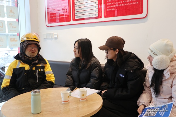 調(diào)研期間,實(shí)踐隊(duì)在街道統(tǒng)籌安排下,深入街道新就業(yè)群體服務(wù)驛站、新業(yè)態(tài)站點(diǎn)及“暖新聯(lián)盟”商家,通過實(shí)地走訪、座談交流、問卷調(diào)研等形式,與一線騎手、站點(diǎn)負(fù)責(zé)人、社區(qū)工作者面對面溝通。他們詳細(xì)了解新就業(yè)群體工作生活狀況、現(xiàn)實(shí)需求與參與基層治理意愿,重點(diǎn)調(diào)研志愿積分激勵、“五大員”培育、“黃小蜂助老送餐隊(duì)”等特色項(xiàng)目的運(yùn)行成效。街道以服務(wù)型治理搭建信任紐帶、引導(dǎo)新就業(yè)群體融入基層治理的工作模式,為高校專業(yè)研究提供了鮮活的實(shí)踐樣本。
