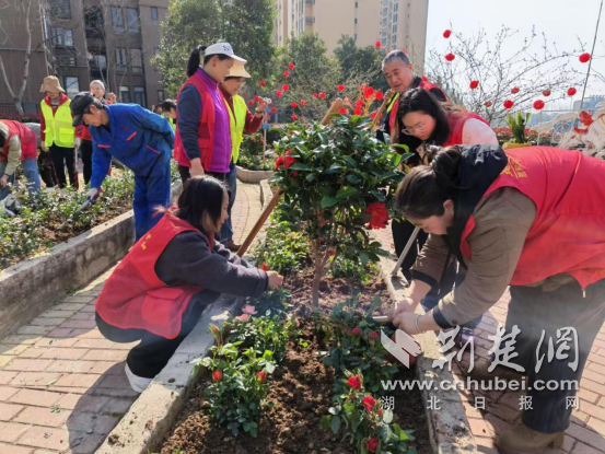 黃陵社區(qū)清理共享花園雜草并栽種花苗。通訊員供圖
