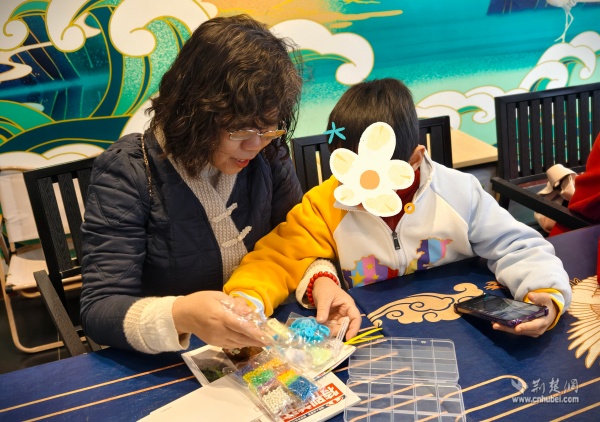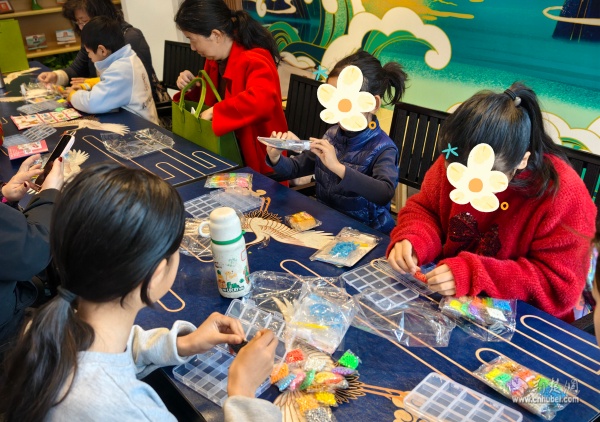 在手工制作環(huán)節(jié),愛(ài)心媽媽們與孩子們圍坐在一起,共同創(chuàng)作拼豆手工作品。一顆顆五顏六色的小小塑料豆,在孩子們專注的目光中、在稚嫩小手的擺弄下,逐漸變成可愛(ài)精美的圖案。
