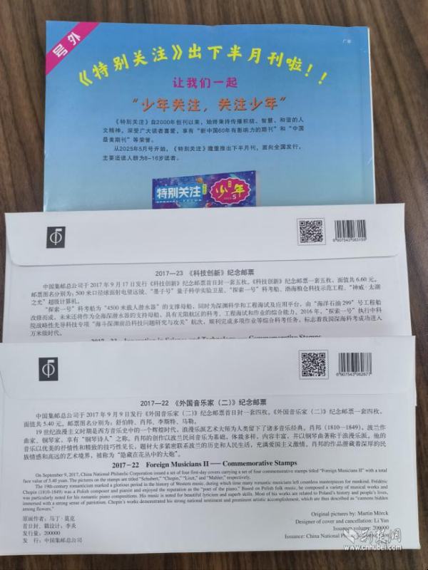 活動(dòng)伊始,武昌區(qū)郵政分公司精心準(zhǔn)備了一份份“精神食糧”,將科技創(chuàng)新、音樂(lè)家等不同主題的首日封以及《特別關(guān)注》雜志贈(zèng)送給參與活動(dòng)的小朋友們。首日封上精美的郵票圖案記錄著時(shí)代的印記,雜志中蘊(yùn)含的人生智慧啟迪著幼小的心靈。