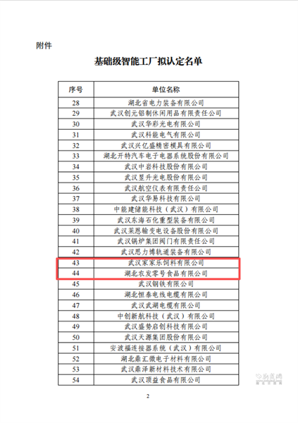 荊楚網(wǎng)(湖北日?qǐng)?bào)網(wǎng))訊(通訊員 曾靜子 范漫 望亞男)近日,武漢市經(jīng)濟(jì)和信息化局發(fā)布《關(guān)于2026年基礎(chǔ)級(jí)智能工廠擬認(rèn)定名單的公示》。經(jīng)企業(yè)自主申報(bào)、各區(qū)推薦及市級(jí)復(fù)核等程序,湖北農(nóng)發(fā)集團(tuán)旗下武漢家家樂(lè)飼料有限公司與湖北農(nóng)發(fā)零號(hào)食品有限公司成功入選。本次全市共有57家單位獲得認(rèn)定,兩家子公司位列其中。