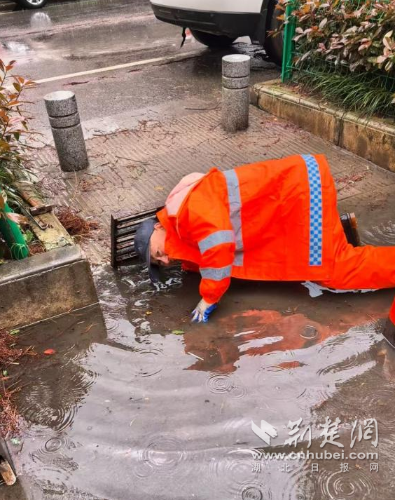 在街道的主次干道上,一群“橙色身影”同樣在風(fēng)雨中逆行。晨曦路、康泰路沿線,雨水裹挾著落葉、淤泥和塑料袋涌入雨水井,排水口頻頻告急。湘口街環(huán)衛(wèi)中心20名作業(yè)人員頂風(fēng)冒雨,對(duì)40余處井蓋展開緊急清淤。黨齡32年的彭新山俯身徒手掏挖的身影格外引人注目。他半跪在積水中,手持鐵鉤撬開井蓋,直接探進(jìn)胳膊一把把掏出堵塞的枯枝爛葉,泥漿濺滿臉身也渾然不顧。“這個(gè)口子堵得厲害,不掏干凈路面積水下不去,老百姓走路、開車都危險(xiǎn)。”