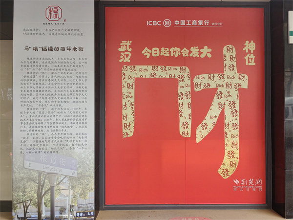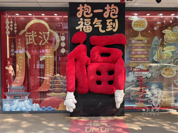 在工商銀行糧道街支行的墻面上,一個(gè)用紅色毛絨打造的巨型“?!弊盅b置,正伸出憨態(tài)可掬的“手臂”,熱情地向路人發(fā)出邀請(qǐng)——“抱一抱,福氣到”。配合地面“福氣UPUP”的躍動(dòng)光影,冰冷的建筑立面被瞬間激活,化為一個(gè)充滿人情味與互動(dòng)感的“福氣地標(biāo)”,吸引人們駐足擁抱、合影留念。就在一旁,一幅色彩斑斕的“武漢美食地圖”櫥窗徐徐展開(kāi),黃鶴樓的巍峨與熱干面、豆皮的市井風(fēng)味奇妙同框,卡通的吉祥物熱情招手,將“舌尖尋古味,巷深有乾坤”的故事,直觀地講述給每一位行人。