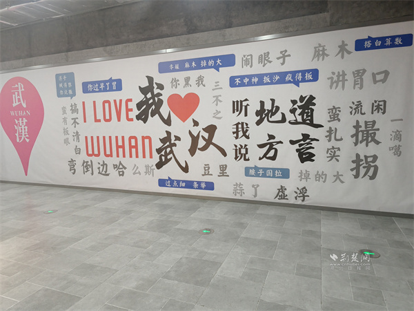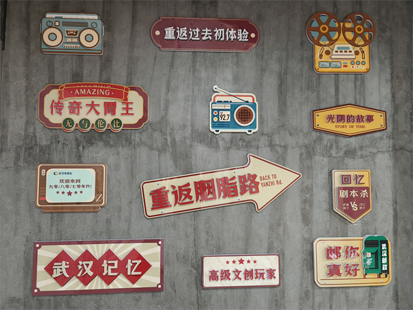在武商超市胭脂路店前,那面“方言文化墻”便是最生動(dòng)的注解。墻面中央,“我愛(ài)武漢”的大字旁,是“零醒、麻木、掉的大”“鬧眼子”“蠻扎實(shí)”等一串地道漢味俚語(yǔ),保留了本土語(yǔ)言那股子鮮活、野性而直接的“脾氣”。側(cè)面墻上點(diǎn)綴的復(fù)古收音機(jī)、老式相機(jī)裝飾牌,與“重返胭脂路”、“武漢記憶”的標(biāo)識(shí),共同構(gòu)成了一扇通往舊日時(shí)光的“穿梭門”。