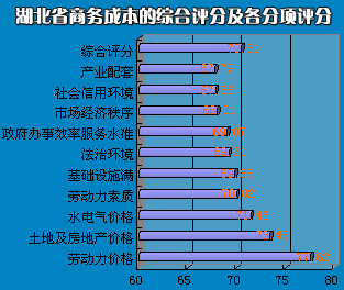 投資者對(duì)影響我省商務(wù)成本的十大因素的評(píng)價(jià)都較均衡,各項(xiàng)評(píng)分介于67.8-77之間,綜合評(píng)分70.51,正好位于基本滿意(60)與滿意(80)區(qū)間的中位。較去年同類調(diào)查數(shù)據(jù)相比,提高3.5分。