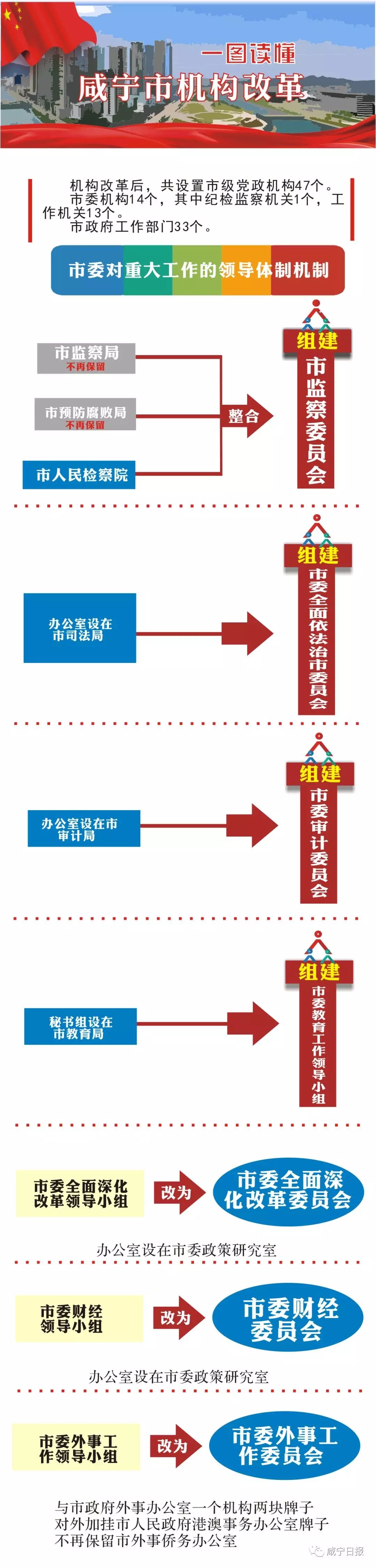 我市召開(kāi)機(jī)構(gòu)改革動(dòng)員大會(huì),標(biāo)志著我市機(jī)構(gòu)改革全面啟動(dòng)。根據(jù)省委省政府批準(zhǔn)的《咸寧市機(jī)構(gòu)改革方案》,本輪機(jī)構(gòu)改革后,市本級(jí)共設(shè)置黨政機(jī)構(gòu)47個(gè)。市委機(jī)構(gòu)14個(gè),市政府工作部門(mén)33個(gè)。改革方案還對(duì)黨政直屬事業(yè)單位實(shí)施了限額管理,并進(jìn)一步規(guī)范了黨政派出機(jī)構(gòu)置。