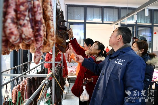 在肉類攤位前,剁了20多年肉砧板的胡金山割肉的手麻利多了——他邊賣肉,邊招呼顧客,今天喜遷新市場,瞧這秤也足足的。排著長隊購買“兩頭烏”豬肉的顧客不時盯著屏幕上中央電視臺拍攝采訪這位養(yǎng)豬大戶的專題片,有的掃一掃二維碼,看養(yǎng)豬場實況。