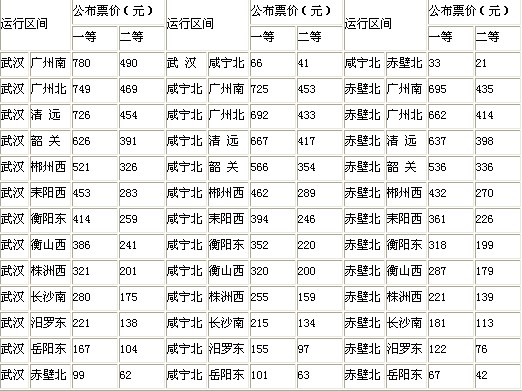 武廣客專(zhuān)高速動(dòng)車(chē)組列車(chē)票價(jià)表