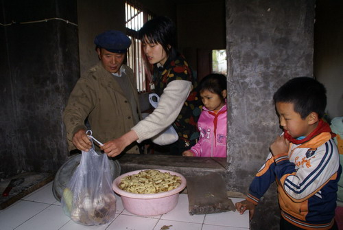 圖為:早晨,丁潔將學(xué)生帶的土豆、玉米面、蒜頭等送到“愛心食堂”(由社會(huì)愛心人士捐建的),交給食堂師傅給孩子們做中餐