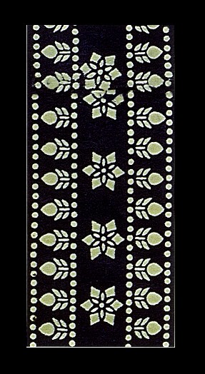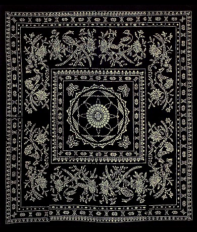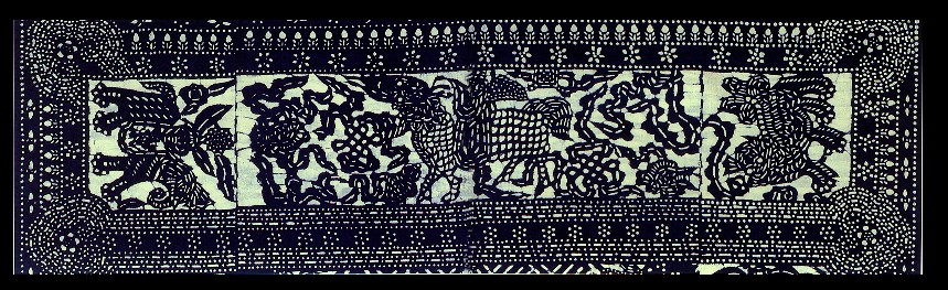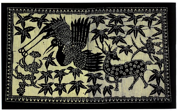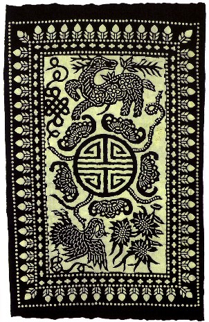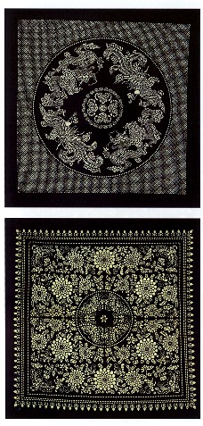 藍(lán)印花布遍及湖北全省,尤以天門(mén)藍(lán)印花布最負(fù)盛名。其特點(diǎn):1、藍(lán)與白的選擇,藍(lán)白兩色并非吉祥色,然而經(jīng)過(guò)藝人們的巧妙的藝術(shù)處理,使人感到清新明快;2、虛與實(shí)的結(jié)合:以點(diǎn)組成線,以線組成面,若合若離,似為一體,實(shí)又分離。